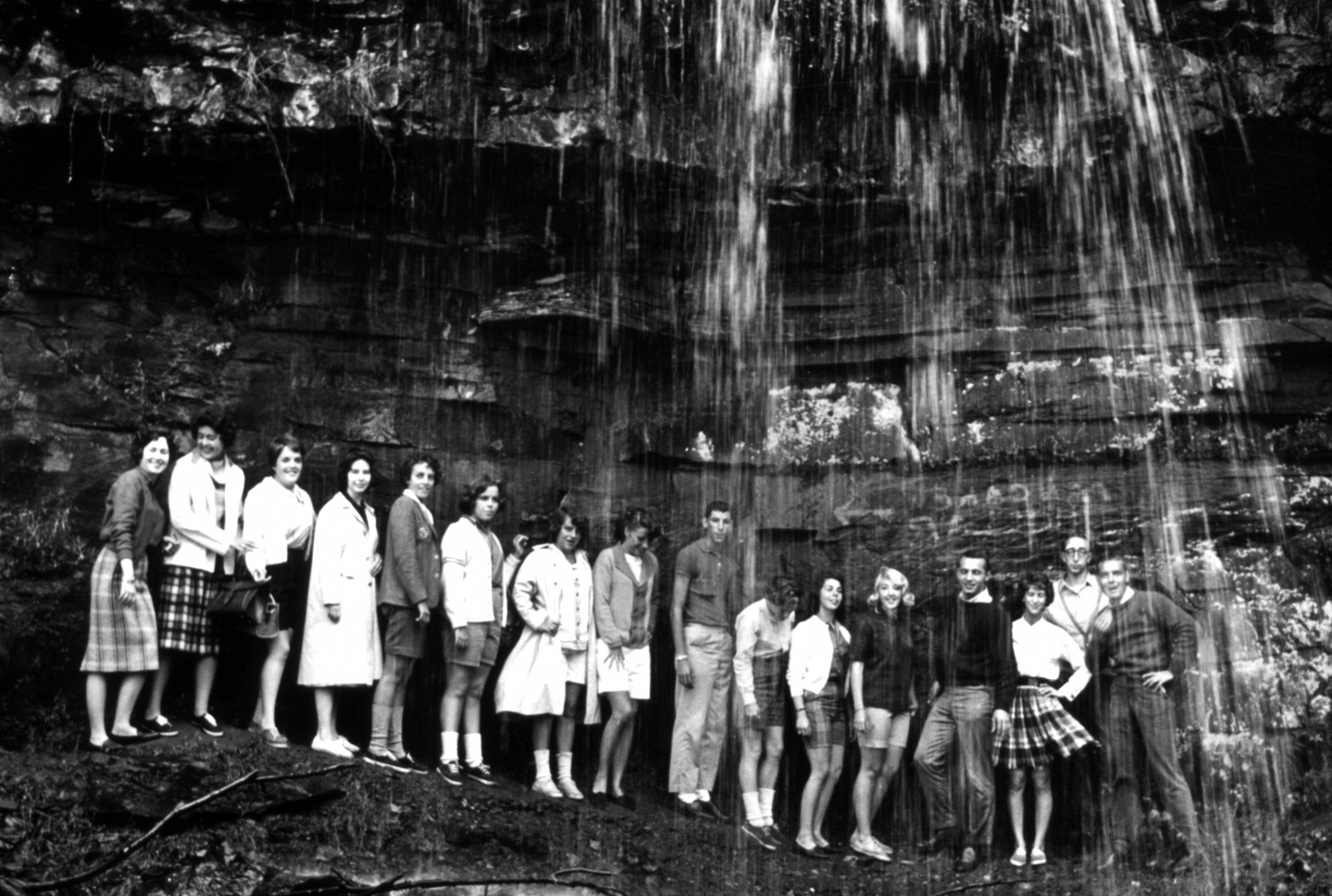 | Description: | Paterson State College students pose underneath Buttermilk Falls in an undated photo. |